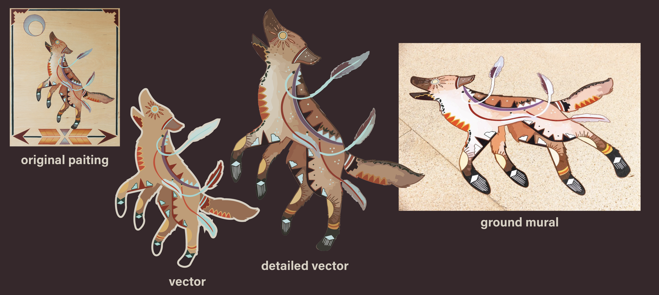 Description text goes hereI have been tasked with supporting the talented artist Felicia Gabaldon, a member of the Choctaw Tribe from the United States. As a painter, Felicia needed her artwork to be converted to vector format so that it could be replicated for the installation as well as any promotional items for the event. I helped Felicia by converting her artwork to vector format and making necessary edits to ensure that the final product could be installed as a ground mural and printed on a large scale.